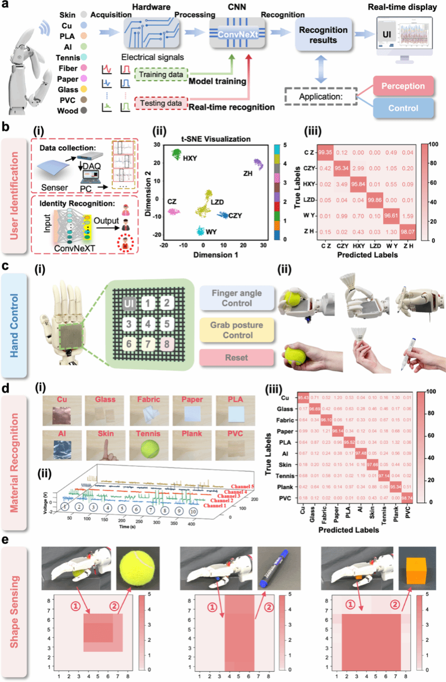 TE-Skin 依托深度学习算法对摩擦电信号的精准解码,实现在灵巧手上的四大核心功能突破: