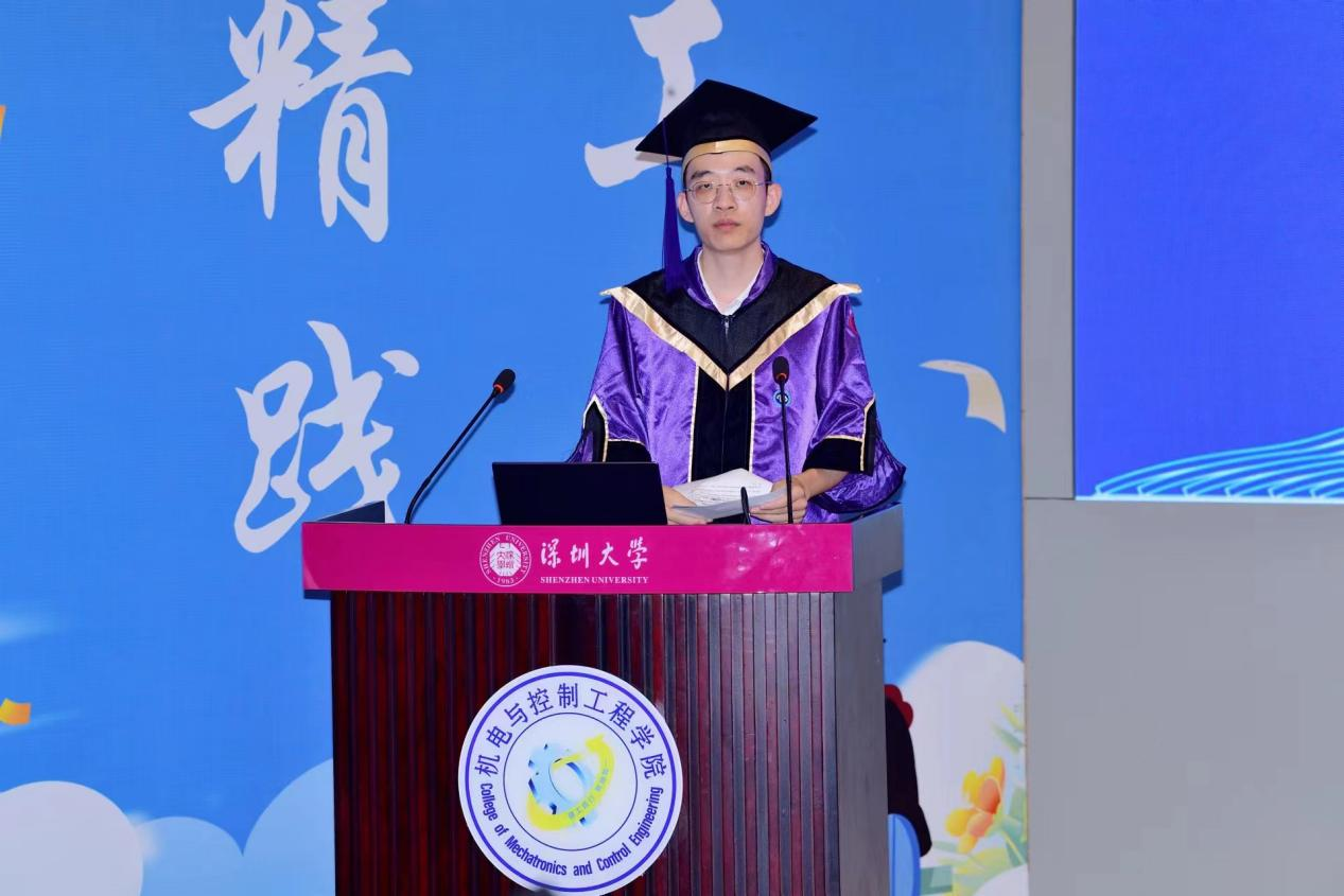随着庄严的国歌声响起,毕业典礼正式拉开帷幕。学院优秀毕业生代表本科生陈星宇和硕士生谢岩松分别发言。陈星宇深情地回顾了大学四年的点点滴滴,从初入校园时的青涩懵懂到如今的成熟自信,每一步都凝聚着汗水与努力。他特别感谢了 RobotPilots 机器人实验室,表示正是 RobotPilots 的经历让他不断挑战极限,突破自我,收获成长。他鼓励所有同学在以后都能够“坦诚,极致,志远,忘我,不功利”,怀揣梦想,继续前行。谢岩松回顾了自己在科研道路上的探索与发现,感谢学院提供的良好科研环境和导师的悉心指导,也感谢同学们的相互支持与鼓励。他呼吁全体同学将所学知识与技能应用于实践,时刻保持严谨认真,脚踏实地,保持初心。下一个惊天动地的“工业奇迹”,也许就是由各位学子来亲手拧上其中的一颗螺丝。